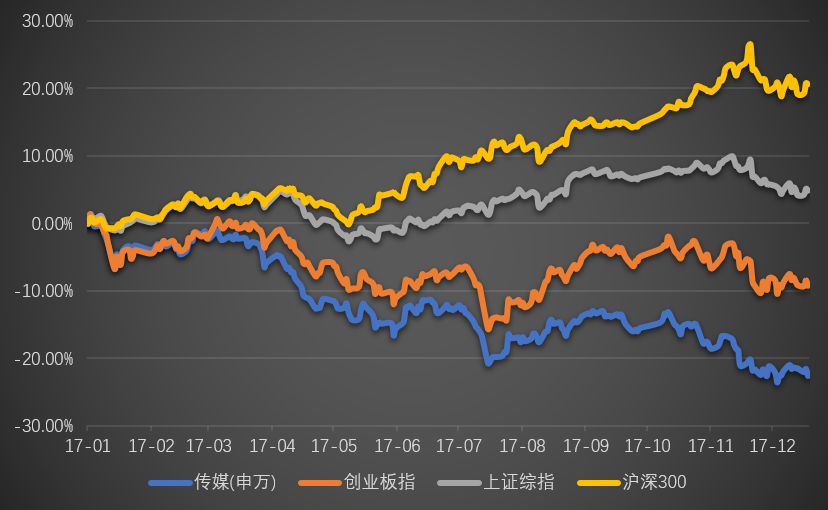 在经过2016年的大跌之后,2017年的传媒板块没有丝毫反弹。截至12月20日,传媒板块下跌22.54%。而同期的上证综指上涨4.84%,沪深300上涨20.59%,创业板指下跌9.21%。