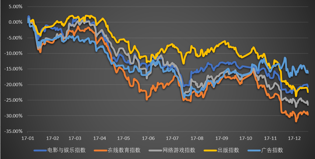 如将传媒板块分为电影娱乐(882462.WI)、在线教育(884156.WI)、网络游戏(884080.WI)、出版(882463.WI)以及广告(882460.WI),五大板块2017年都有不同程度下跌。截至2017年12月20日,五大板块的全年跌幅均超过了15%,其中在线教育指数累计跌幅达到29%,网络游戏指数跌幅超过25%。