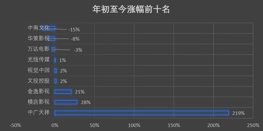 电视剧制作方面,民营电视剧制作龙头华策影视(300133.SZ)市值为185亿,今年以来跌幅为8%。另外,慈文传媒(002343.SZ)、欢瑞世纪(000892.SZ)等今年股价表现不佳,跌幅分别达到23%与48%。究其原因,与需求端和供给端两方面的压制有极大关系。