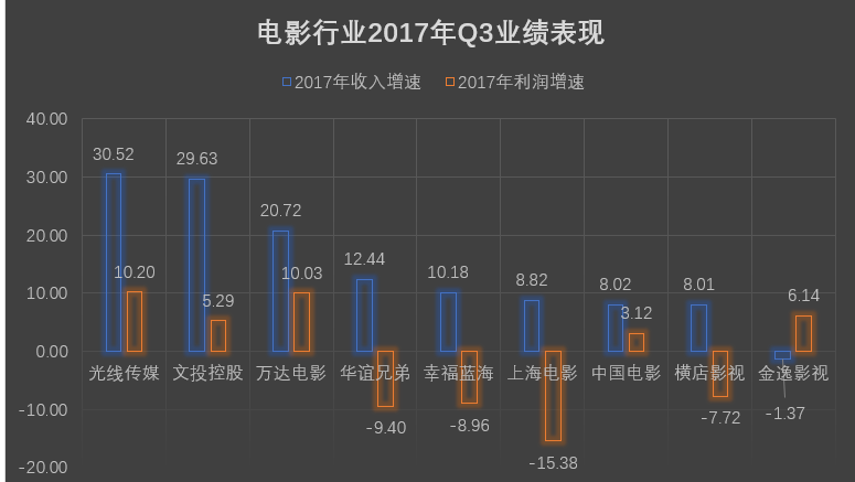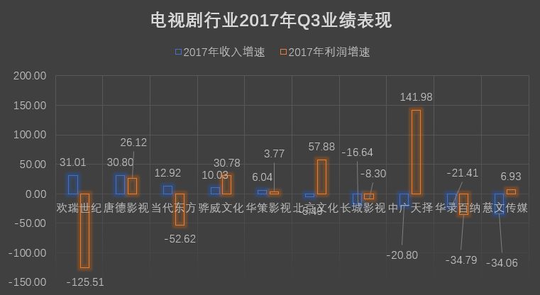 因此从电视剧的内容制作方来看,精品化以及头部剧集将持续受到追捧。而二、三线的制作单位将面临极大冲击。业绩方面看,2017年各大电影以及电视剧行业公司的业绩增速都处于中枢水平。电影行业的收入增速略高于电视剧行业。