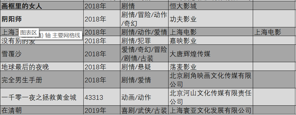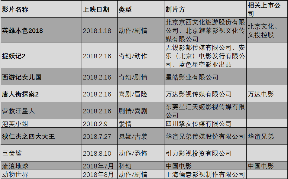至于2018年的看点,界面新闻整理2018年即将上映的电影,以及各大影视公司公布的片单,结合猫眼、豆瓣等第三方口碑平台,总结出2018年较有可能成为票房爆款的电影。根据猫眼以及豆瓣上的数据,在已经确定会于2018年上映的电影中,《英雄本色2018》《捉妖记2》《西游记女儿国》《唐人街探案2》以及《狄仁杰之四大天王》等电影期待值较高。这些电影出品方中也包含了北京文化、文投控股、万达电影、华谊兄弟等多家公司。