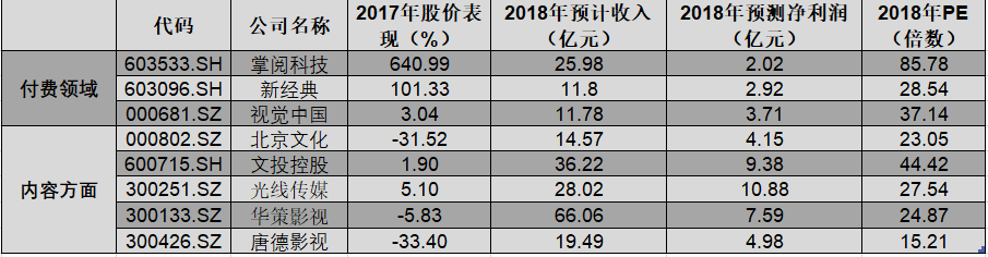 如果要说2017年最受关注的传媒股,当属港股上市的阅文集团(0772.HK)以及A股上市的掌阅科技(603533.SH),两者同属付费阅读领域。特别是阅文集团,一经上市备受追捧,相比发行价,股价一度大涨80%。事实上,不仅仅是移动阅读的兴起,甚至连图片、知识、音乐领域的付费习惯的养成,都将使得付费领域成为2018年主要的投资逻辑。
