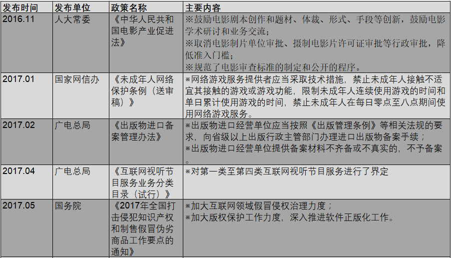 值得注意的是,2017年传媒行业的政策逐渐收紧,呈现日益规范化、正规化的趋势。