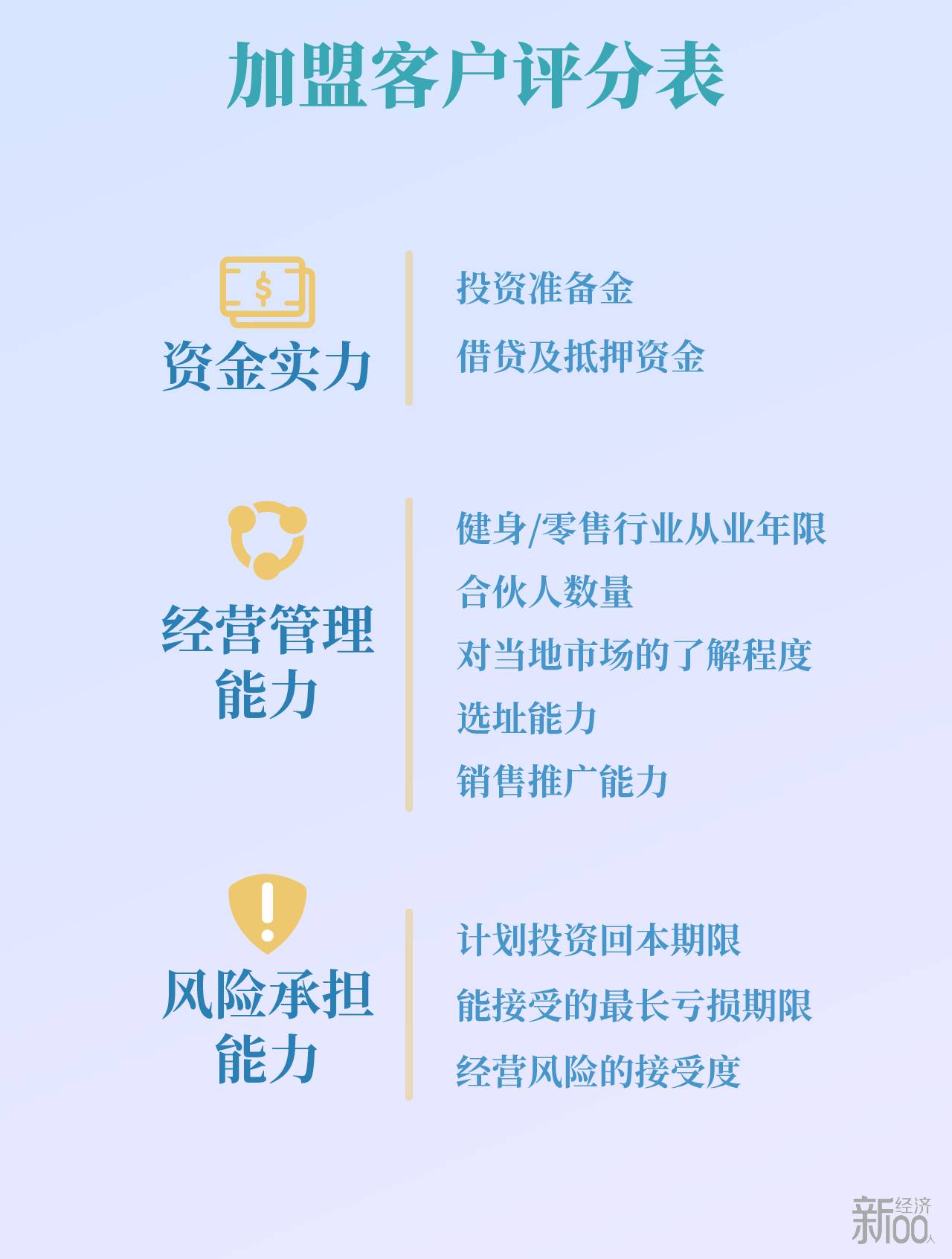 Liking Fit想要盈利,其次得让加盟商盈利。前期对加盟商的筛选很重要,Liking Fit COO石洪超把加盟商筛选标准细化成为资金能力、经营管理能力、风险承担能力等12个评分项目,满分60分,及格36分,通过面试培训等流程筛选加盟商。