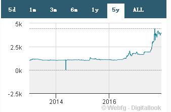 瑞士央行本身的性质就比较特殊,作为一家股份制银行,其45%的股票都在交易所里流通。近两年以来,其股价上涨超过250%,下图为瑞士央行股价走势: