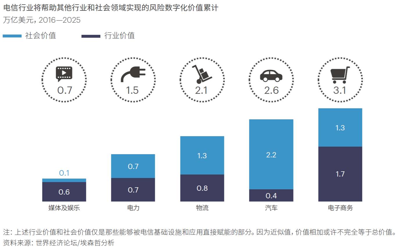 据埃森哲与世界经济论坛分析,预计到2025年,仅电子商务、汽车、物流、电力和媒体及娱乐五大行业的数字化进程中,就有超过10万亿美元的社会和行业价值将依赖于电信行业及其数字通信生态系统的支持方能实现。