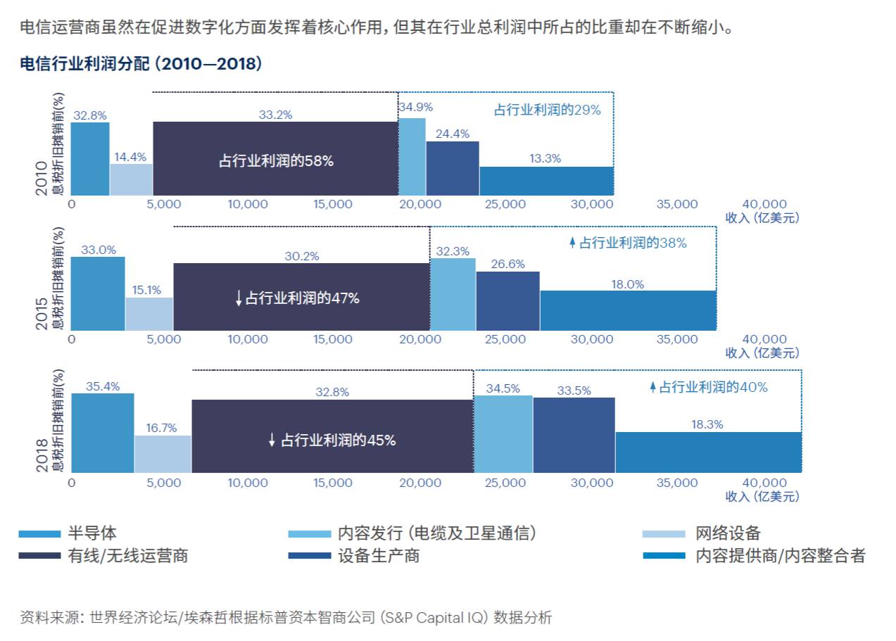 但与此同时,相比五年前,运营商在行业总利润中所占比重不大,且有进一步减少的趋势。这一方面源自传统语音和短信业务受到数字业务的“侵蚀”,另一方面则由于传统运营商未能及时启动新的商业模式,并将其规模化。