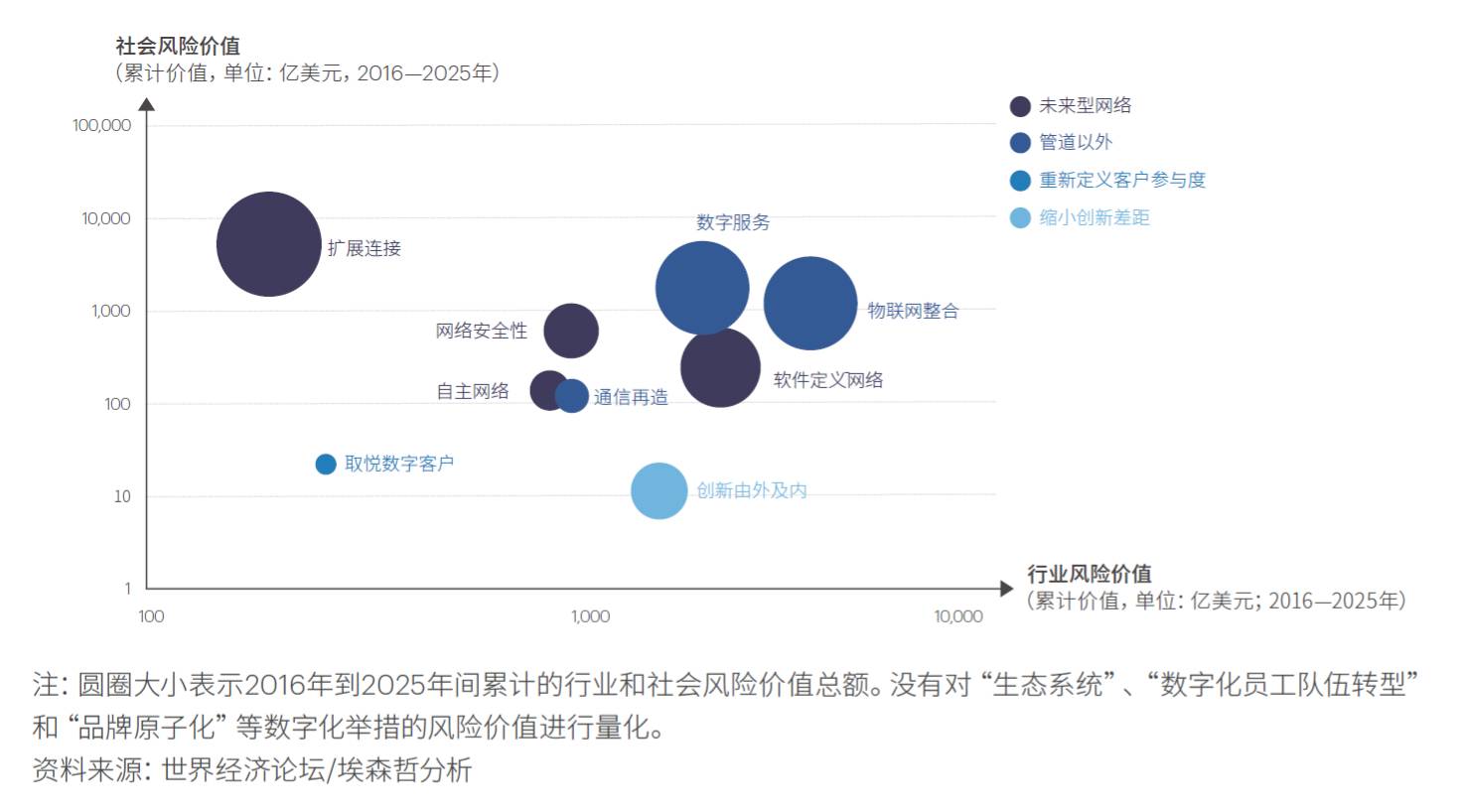埃森哲与世界经济论坛的分析表明,从现在起到2025年的近十年间,未来型网络、管道以外、重新定义客户参与度、缩小创新差距这四项数字化主题,将对电信行业数字化转型产生最大影响。