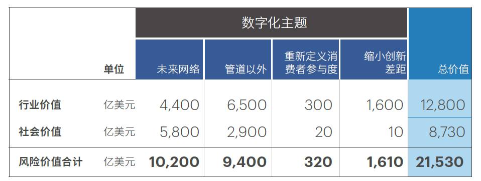 这一转变将是电信行业变革的重中之重。在2万亿美元的行业和社会价值之中,“未来网络”主题就占到了1万亿美元。尤其是它的社会价值,远高于其他三个主题。这主要源于全球范围内的互联网普及——不仅包括新的网络用户,也包括在整体经济上产生的乘数效应——它占到了该主题下5800亿美元社会价值的84.5%。