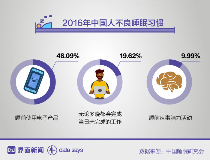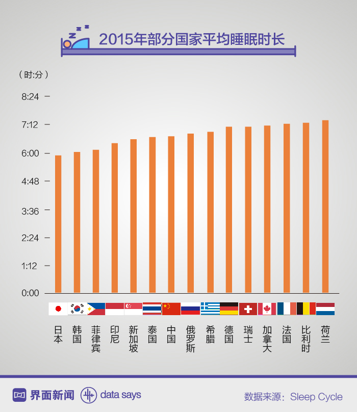 睡眠应用软件Sleep Cycle在2015年发布的《全球睡眠报告》显示,中国人平均睡眠时长为6小时43分钟,在50个国家中排名第28(从多往少)。从各个国家的睡眠数据来看,亚洲人的睡眠时长一般短于欧洲人,其中日本人的睡眠时间最短,不到6小时。
