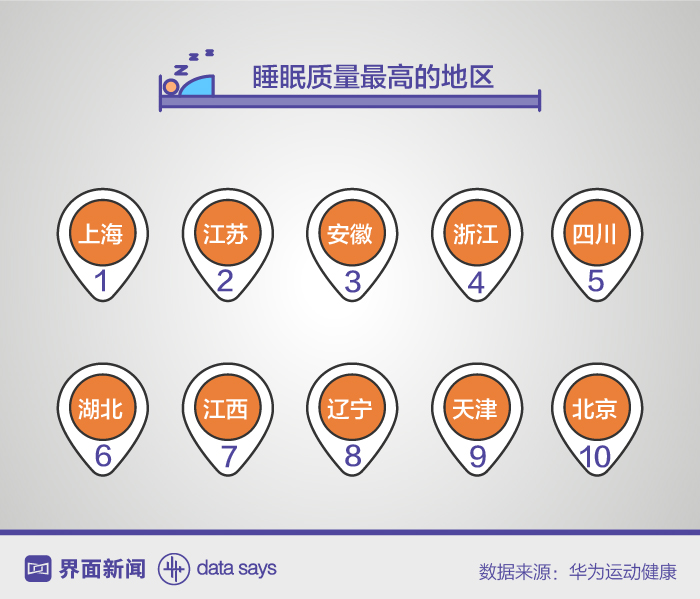 华为运动健康数据显示,2017年中国睡眠质量最高的地区是上海、江苏和安徽,最差的则是西藏。