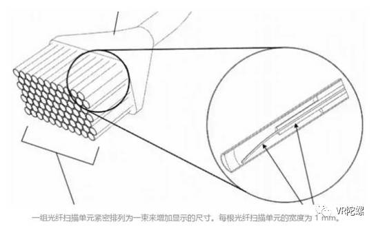 Magic Leap One采用了光纤扫描光场显示技术,该技术使用一组致动光纤来扫描输出远大于其数值孔径的图像。这就像老式的显像管电视。只不过不是扫描输出电子到荧幕来激发荧光粉发光,而是直接扫描输出光。扫描是通过压电致动器来实现的。扫描频率保持在大约几十 kHz。但实际图像刷新率并没有那么高。因为需要多次扫描(专利里面举例如 250 次)才生成一整幅图像。这完全改变了我们对于分辨率的概念。这个技术的图像分辨率取决于光纤的扫描频率,光纤可以汇聚的最小光斑尺寸(这决定了像素大小),生成一幅图像所需的扫描次数和刷新帧率。