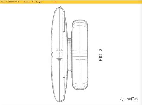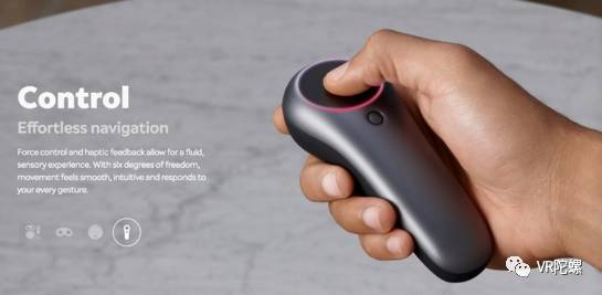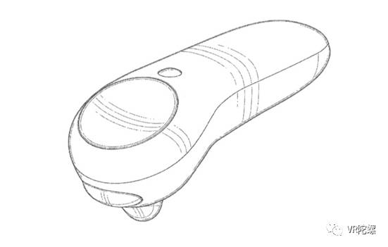 官方介绍可知,手柄上方为可触摸圆盘,同时手柄支持6自由度。外观来看,手柄采用流线型圆润设计,触摸圆盘环绕着与lightpack同设计语言的红蓝渐变灯线,正面触摸板下方电源一枚。另根据Magic Leap手柄专利图,手柄还配备扳机键与肩键。