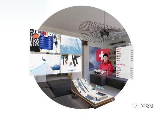 在演示图中,我们可以看到客厅中漂浮着多个数字屏幕,用户可以多屏同时观看,而观看不限于平面,图中真正的桌子上正进行着冬季运动演示。