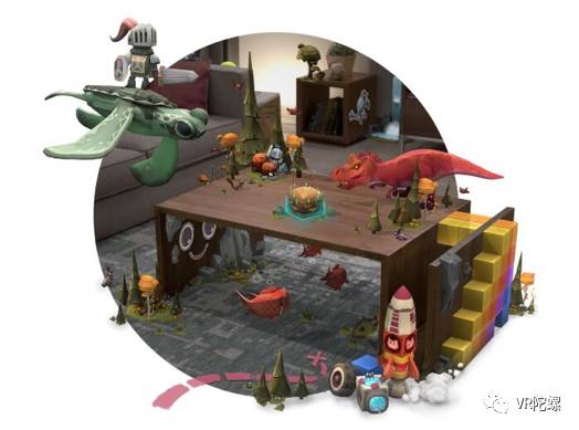 演示图中,我们可以看到数字飞碟,恐龙和树木等幻想图像在客厅中与真实的物品互动。