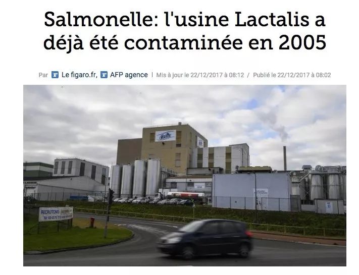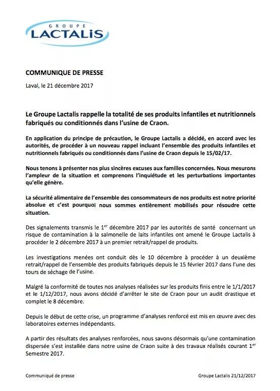 12月10日,法国卫生部发布公告,宣布因产品疑似受到沙门氏菌污染,暂停兰特黎斯集团CRAON工厂2017年2月15日(含)之后生产的所有婴幼儿配方食品销售及出口,并对相关产品进行召回。国家