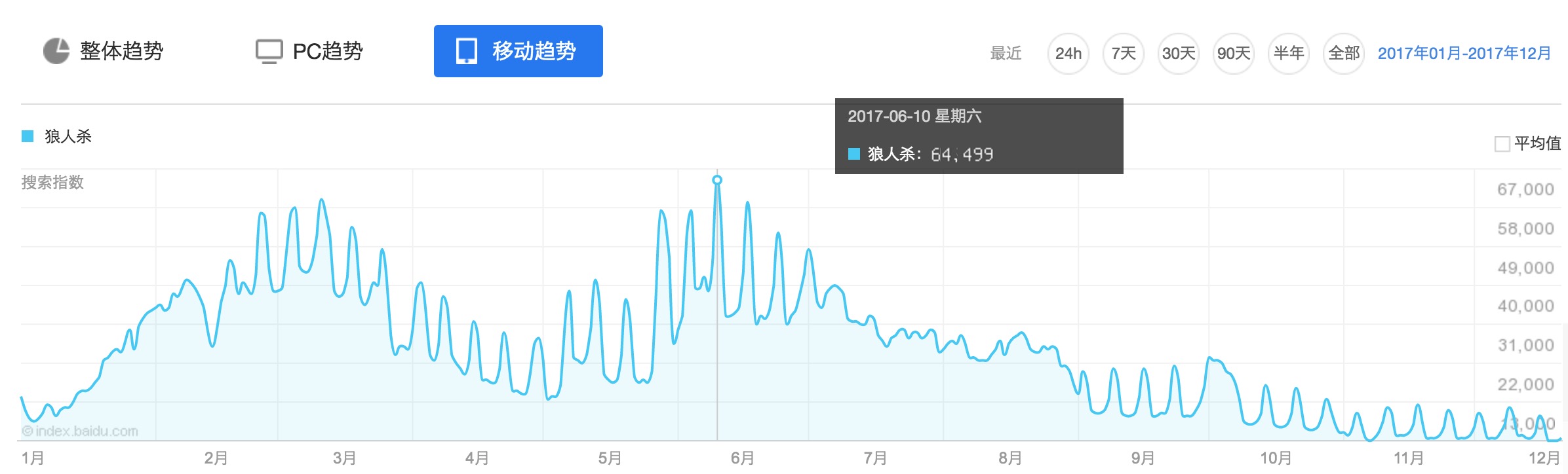 在年轻人中风靡了很久的狼人杀游戏,近两年从线下火到线上,在2017年成为了游戏圈内的众多风口之一,与《阴阳师》《王者荣耀》和一众“吃鸡”手游相比毫不逊色。狼人杀游戏多以8-18人共同参与较量,融合了策略、推理、口才等烧脑元素,受到了一二线城市白领和大学生群体的欢迎。自2015年起在网络综艺和网红主播的助力和推动下,狼人杀游戏迅速风靡全国。
