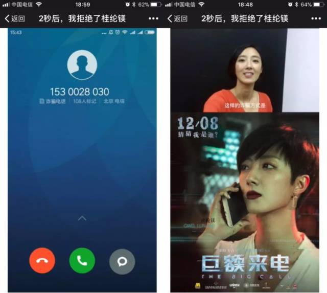 首先《2秒后我拒绝了桂纶镁》这个标题都极具悬念性,此外,H5内容又是现在社会时常发生的电话短信诈骗,并由桂纶镁出演,结合即将上映贺岁大片《巨额来电》,广告由小米公司制作。“社会热点+女神明星+贺岁大片+IP公司”,实现一次刷屏营销。