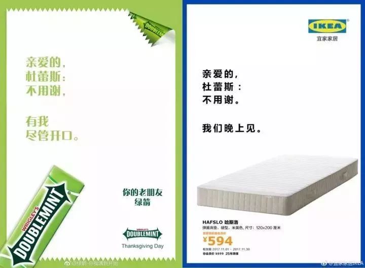杜蕾斯算是新媒体的“老司机”了,感恩节,杜蕾斯上演了一出“十三撩”,事先未通知绿箭等13个品牌,率先开撩,各大品牌的积极互动回应,演变成一场全民围观的大牌互撩。