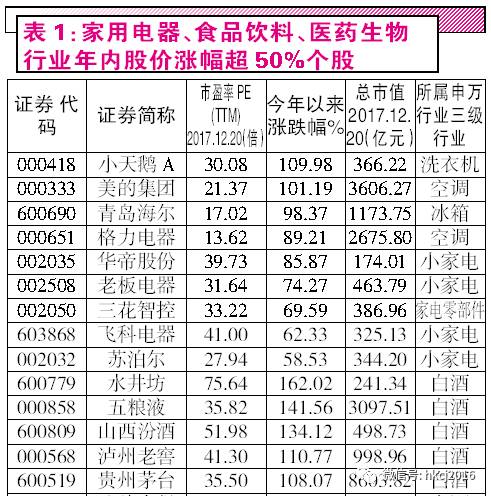 释老毛所谈到的大消费白马股,《红周刊》记者从数据统计结果发现,大消费白马股目前累积了巨大的涨幅,剔除新股及次新股影响,年内消费股中家电板块股价实现上涨的16只个股中,涨幅超过50%的就高达9只,小天鹅A、美的集团甚至实现股价翻倍。在食品饮料行业股价实现上涨的27只个股中,涨幅超过50%的个股也达14只,其中有6只个股实现股价翻倍,且这些翻倍个股均为白酒股,“喝酒”行情走的异常火爆。而在医药生物行业中,复星医药、恒瑞医药等大白马股涨幅也都超过80%(见表1)。