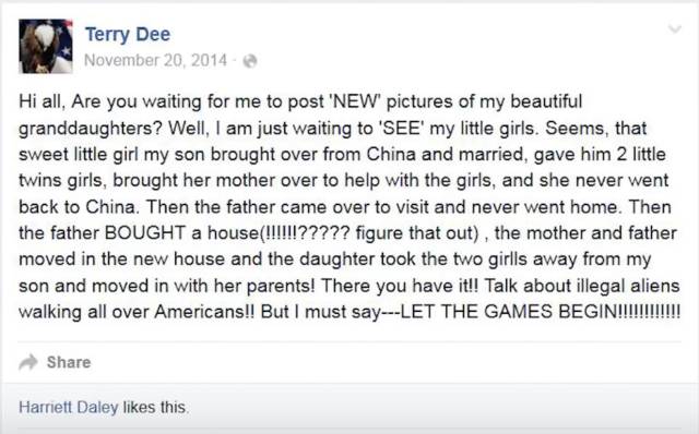 2014年赵老先生将自己国内的积蓄六万元美金拿出来,替自己的女儿与孙女买了套房,并且要求女儿赵晴立刻与丈夫分居,赵维武决定一肩扛起这个家的经济,用自己多年的退休金,来度过眼前的难关。然而这个白人婆婆依然不依不饶:“中国媳妇生了一对双胞胎后,她父母也来了,还买了房子不走了,你们看看,那些非法外籍人在美国到处流窜!!…让我们走着瞧! ”
