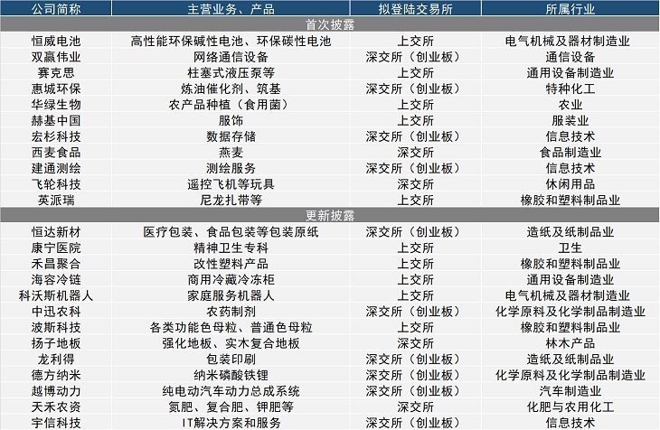 在20日和22日披露招股说明书各细分领域的知名企业包括赛克思液压科技股份有限公司(下称赛克思)、桂林西麦食品股份有限公司(下称西麦食品)、赫基(中国)集团股份有限公司(下称赫基中国)、科沃斯机器人股份有限公司(下称科沃斯机器人)、江苏华绿生物科技股份有限公司(下称华绿生物)等。