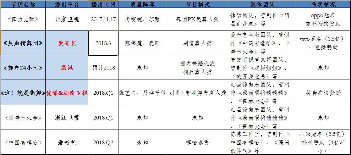 第一个原因或许和明年的综艺风向有关,如下图所示,根据目前四大卫视和三大视频平台放出的招商材料,明年将是一个街舞类综艺节目的大年。