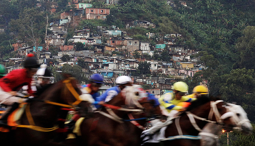 民众聚集在一起观看赛马,手中还举着下注的信息。尽管输的人比赢的人多,但随着委内瑞拉越来越严重的通货膨胀、一夜暴富的假象也就更加诱人。