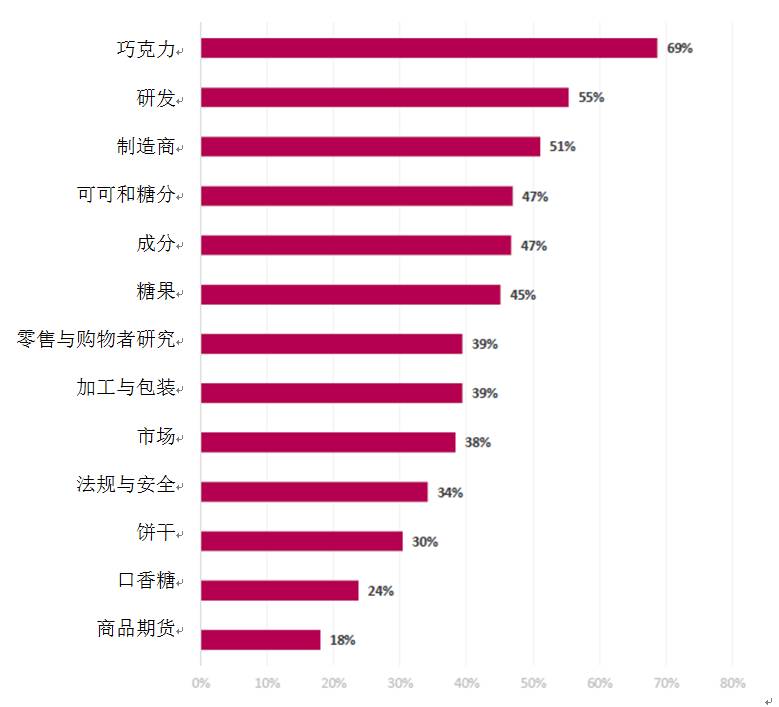 巧克力是糖果行业的命脉,超过三分之二的受访者与巧克力打交道。相比之下,从事糖果类、饼干类和口香糖类工作的受访者比例分别为45%、30%和24%,这大致反映出糖果行业的销售额分布。我们的调查对象范围很广,但通常都是巧克力制造商的研发专家或业务发展经理。了解受访者能使我们更好地诠释调查结果。尽管受访者使用匿名,但我们的问卷数据包含全球五大糖果公司的许多业界专业人士。