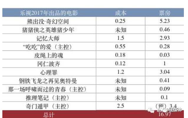 根据公开资料,数娱梦工厂整理出了乐视影业2017年出品电影的情况,乐视影业今年出品了11部电影,另有一部原定今年上映的《生死语者·秦明》还未定档,11部已经上映的电影共计取得了16.97亿的票房。