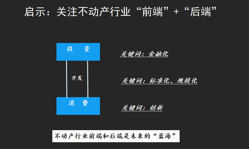 那如何解决资金的问题?钟彬认为,进入资管时代,要关注不动产行业的前端和后端,前端关键词是金融,后端关键词是创新,中间开发是规定动作,不动产的前端后端才是未来的蓝海。当然,前端的金融是前提。