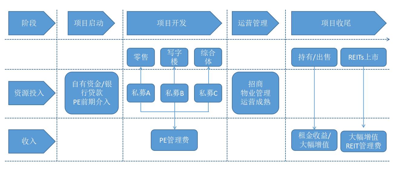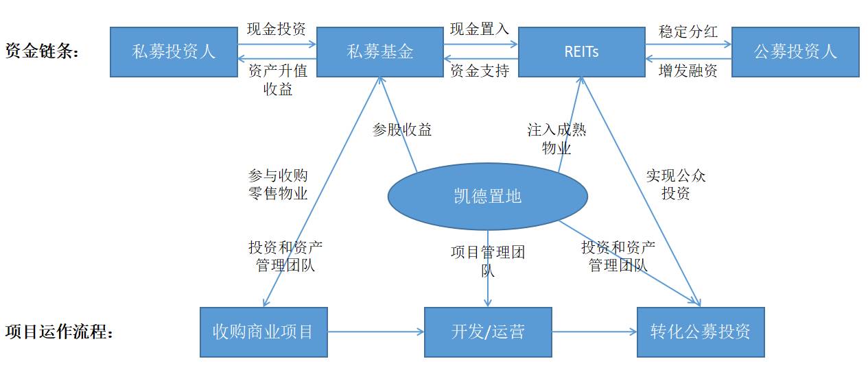 通过“PE+REITs”模式(如上图),凯德既可以在项目开发阶段享受项目增值收益,又能在项目成熟后享受跟投收益和管理费收益。