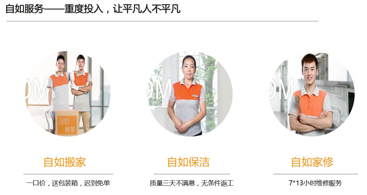 自如的居家服务也有很多种,比如搬家、保洁、家修等。以保洁为例,对于自如的部分产品,由于客厅是公共的,一般没有人打扫,自如可以在合租平台上提供每两周一次的免费保洁,而且进公共区域保洁是不需要人值守的,到时间阿姨就会上门保洁。这很好的解决了年轻租客的痛点——时间忙、怕麻烦。