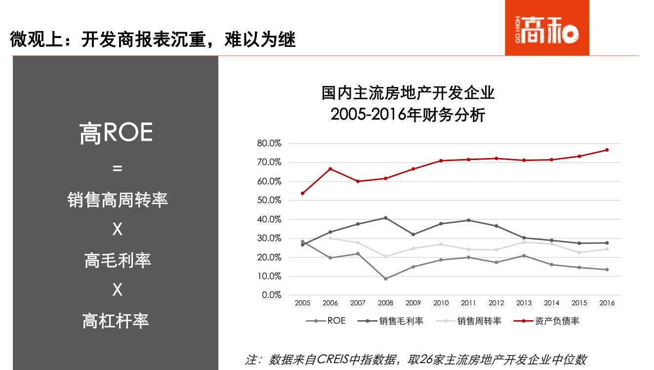 其次,虽然过去这些年,整个市场的规模快速膨胀,然而,开发商ROE却不断下降(如下图),高杠杆、高毛利的方式已经不行。