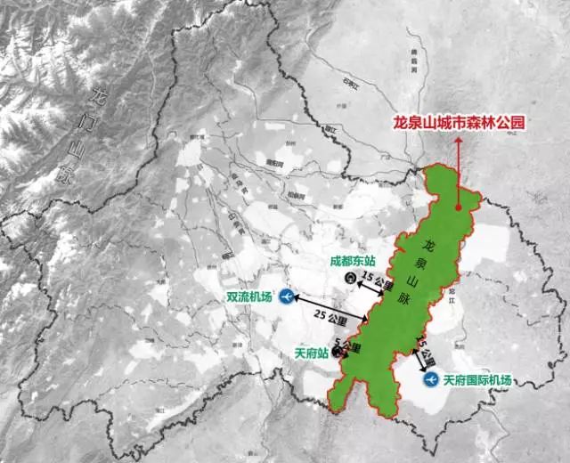 由于东进的规划,成都的格局由 “ 两山夹一城 ” ,变为 “ 一山连两翼 ” ,龙泉山的核心地位尽显,将被以高标准建设成为世界级品质城市绿心和国际化城市会客厅。龙泉山城市森林公园规划面积为 1275平方公里,有960平方公里山地森林景观区、315平方公里山前郊野游憩区2大功能分区,同时由特色小镇和郊野游憩园构成10个游憩单元,形成深丘峡谷、花海林麓、湖光山色3段特色景观。