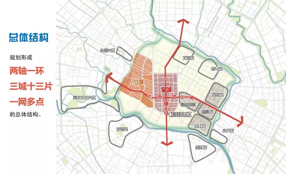 天府锦城即两江环抱区域,包括皇城片区、少城片区及大城片区。其中,