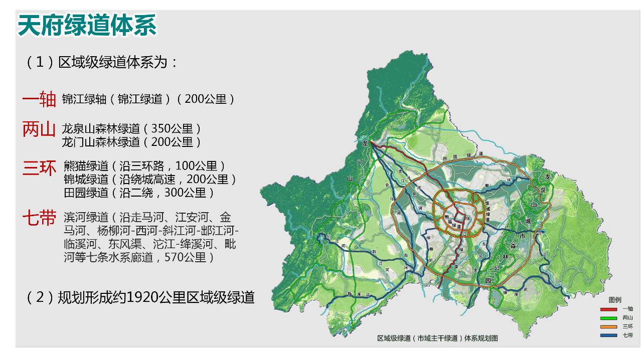 今年9月,成都公布了天府绿道规划建设方案,将按照 “ 可进入、可参与、景观化、景区化 ” 的规划理念,规划建设 “ 一轴、二山、三环、七带 ” 的区域级绿道1920公里、城区级绿道5000公里以上、社区级绿道1万公里左右,全域形成近两万公里的三级天府绿道体系。