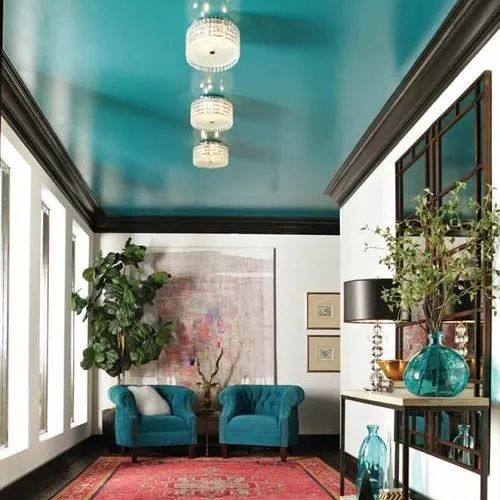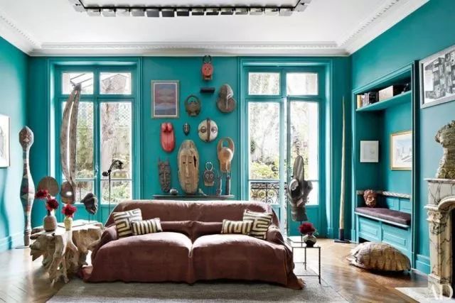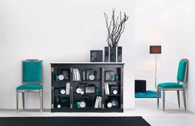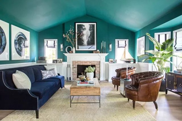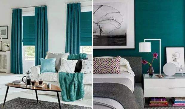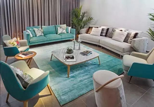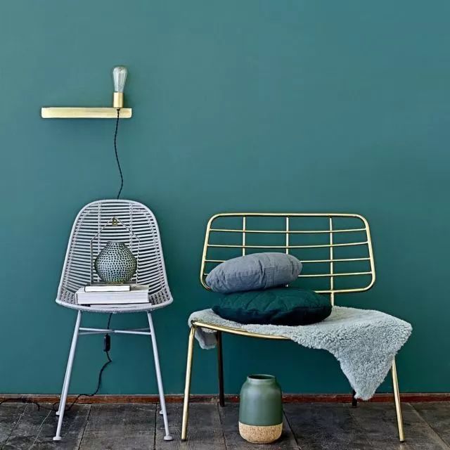 马尔斯绿严格说起来是有点偏蓝的,这种颜色搭上丝绒特别适合做沙发。客厅里摆个马尔斯绿沙发 + 白色靠垫,绝对是最抓眼球的搭配。