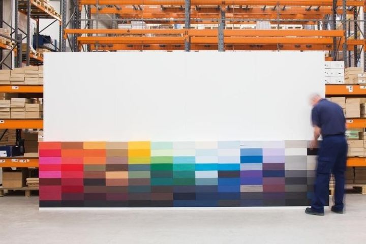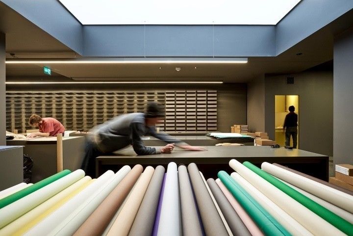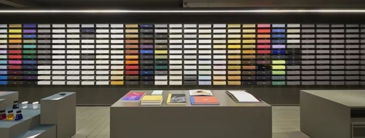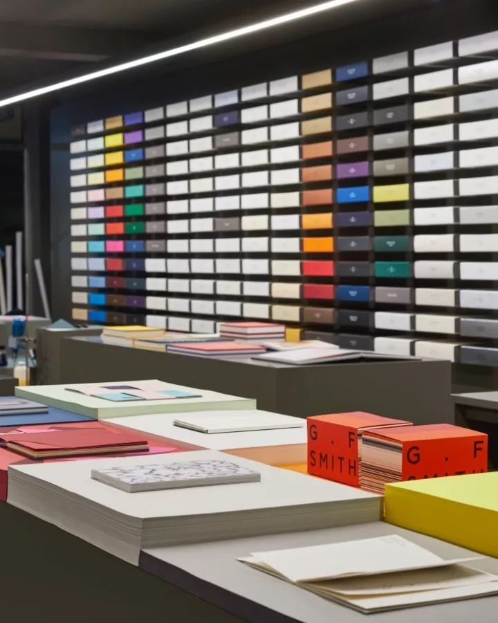 空间内部一面长达14米的“彩墙”上,展示着G.F Smith Colorplan拥有的所有色彩,不仅可以让观赏的人在此了解G. F Smith的彩纸历史,还提供纸张的定制化服务。