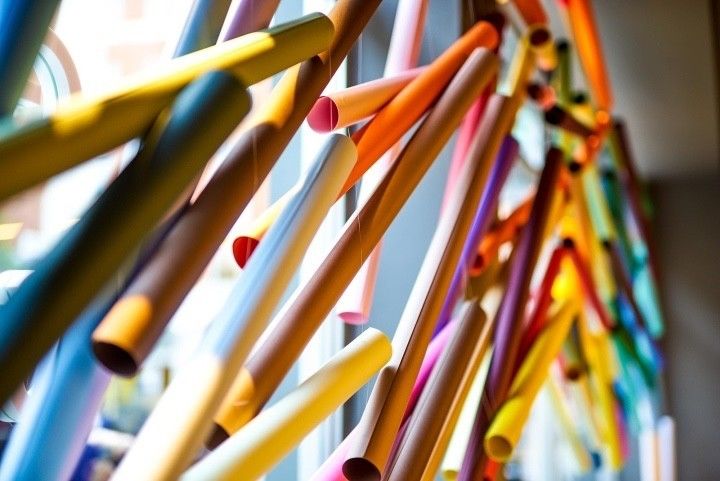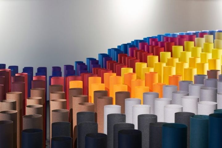 在位于该空间地下一楼的“White Space”画廊中,展示着由G.F Smith老搭档Made Thought设计的海浪纸筒装置“Tida”(潮汐)。通过将Colorplan里不同颜色的纸卷按高低起伏的形态排列,营造出一种具有流动性的视觉效果,远看就像海面上汹涌翻滚着的彩色浪潮。