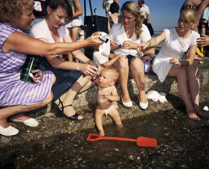 也同样是在80年代,从《最后的度假胜地》这组作品开始,帕尔暂停了黑白摄影的方式,改用彩色胶卷进行创作。他用强烈的色彩与闪光灯曝光等技术,将消费主义环境下的中产生活拍摄成一场场“幽默喜剧”。
