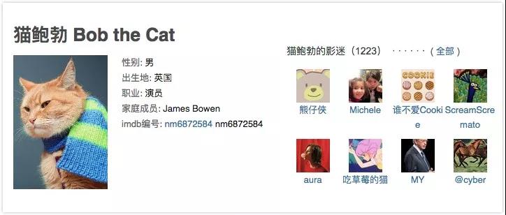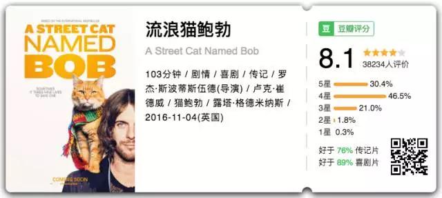 《流浪猫鲍勃》——关于喵星人的英国温情喜剧,改编自真实事件,由流浪猫本猫出演,演技炸裂到据说导演组找了六只猫来演它都没拼过本尊。这只主角猫在豆瓣上真的有“影人条目”,性别:男,出生地:英国,职业:演员,影迷1223人……哈哈哈,快去关注他吧!
