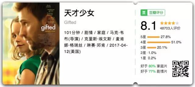 《天才少女》——“美国队长”克里斯·埃文斯主演的家庭温情片,故事略俗套却十分细腻,反差萌的小女孩跟美队非常有爱,电影就如夏日里的一道清新阳光,温暖又治愈。