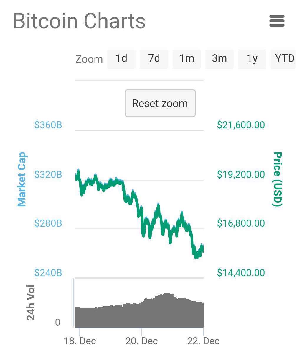 最近一周比特币的价格如同过山车,当然,是向下行驶的过山车。近24小时,比特币价格在12800美元和14500美元之间震荡,至发稿前价格13977.7美元。如果把时间线放宽,比特币价格从12月18日接近20000美元下降到最低点13000,跌幅近35%,总市值已经较最近的高点减少了1100亿美元,相当于特斯拉公司市值的两倍。