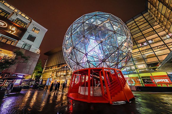上海新天地在过去五年中就试着通过圣诞装置创意,来建立与消费者的互动和情感联系。2013年它第一次做“亲吻”圣诞树,人们只要握住圣诞树下榭寄生的叶片接吻或牵手,就能通过电流点亮整棵树。2016年它变成了魔方搭建而成的树形积木,而今年的则是透明水晶球中的一棵抽象树状黑曜石,不少人说它变得像科幻电影《星球大战》中的光剑。