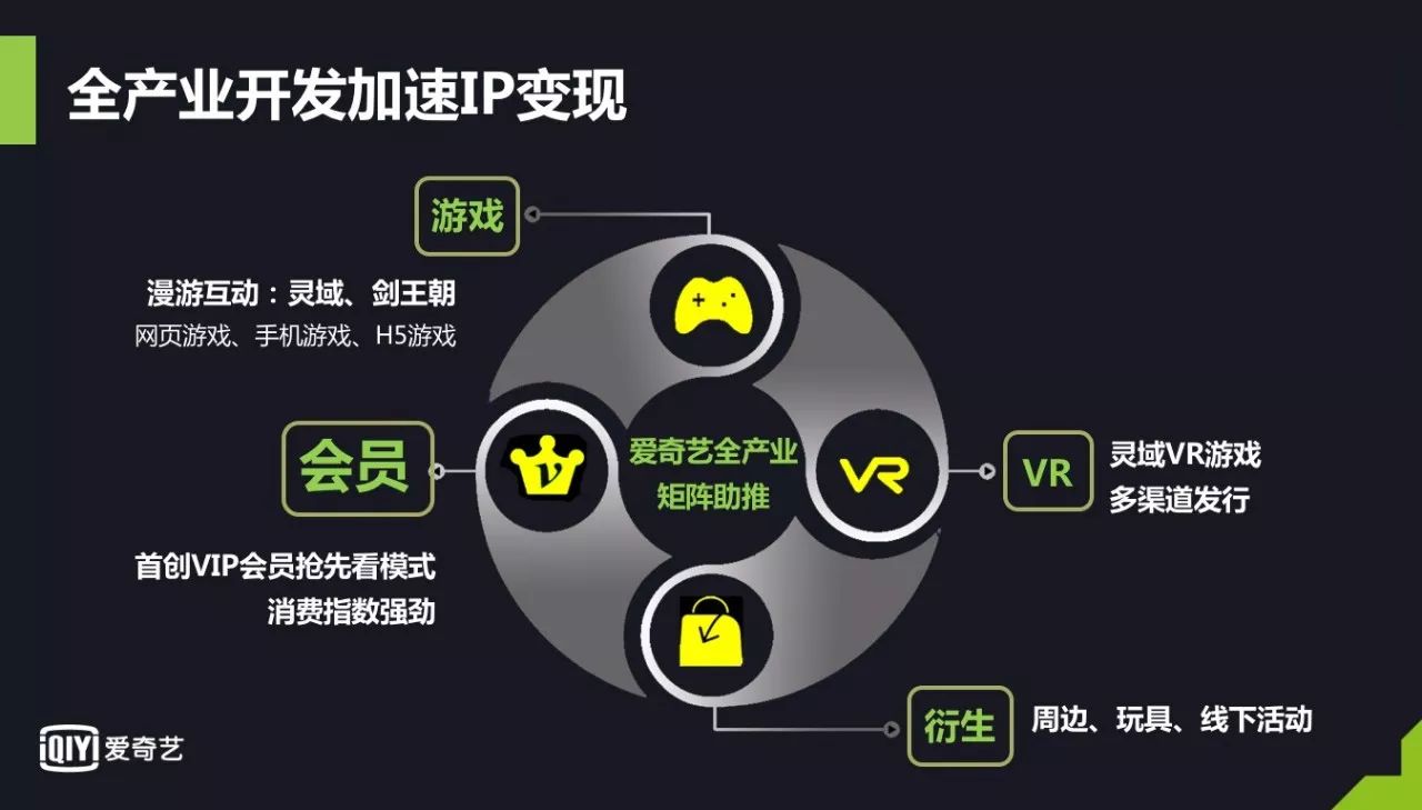 这张图大家可能在很多场合都看到过,是我们爱奇艺的创始人兼CEO龚宇博士在很多场合展示过的爱奇艺的“大苹果树模型”,即同一内容IP下的多种商业模式,它包括了广告、收费、电影、动漫、游戏、电商等衍生生态链。