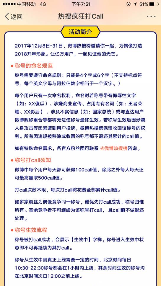 根据活动规则,粉丝可以通过每日参与微博的打call活动,为爱豆争取到2018年的微博热搜称号。各家可以争取同一称号,但称号唯一,归率先打call成功者所有,别家粉丝将不可继续为该称号打call。