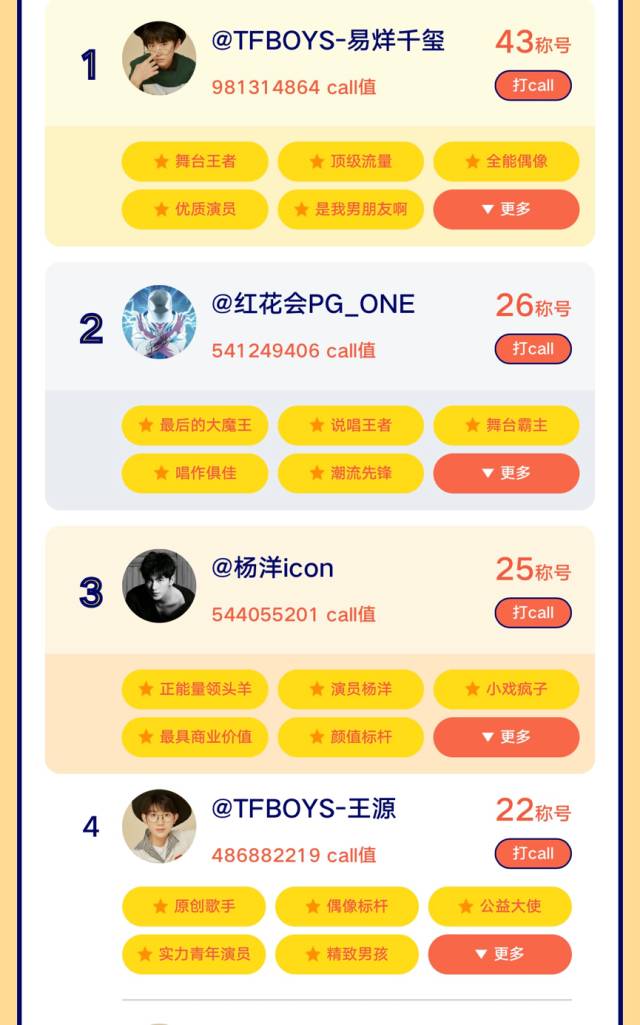 第二名是新晋嘻哈流量PGONE,获得了26个打call称号。第三名的杨洋,25个打call称号。距离打call结束还有6天,不到最后一刻,都说不准哪家粉丝会放大招。