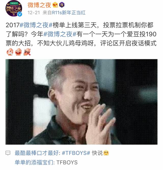 热搜榜、超级话题榜、微博之夜榜、微博king、微博queen、最受欢迎男演员、最受欢迎女演员、最佳歌手、最佳撩粉……这些千奇百怪的榜单,你以为是以往那种年终盘点吗?人家早已经升级为日榜单了。每一天的战况都瞬息万变,今天没拿冠军也就算了,明天还不拿这说的过去吗!根本控制不住粉丝投票的手啊。