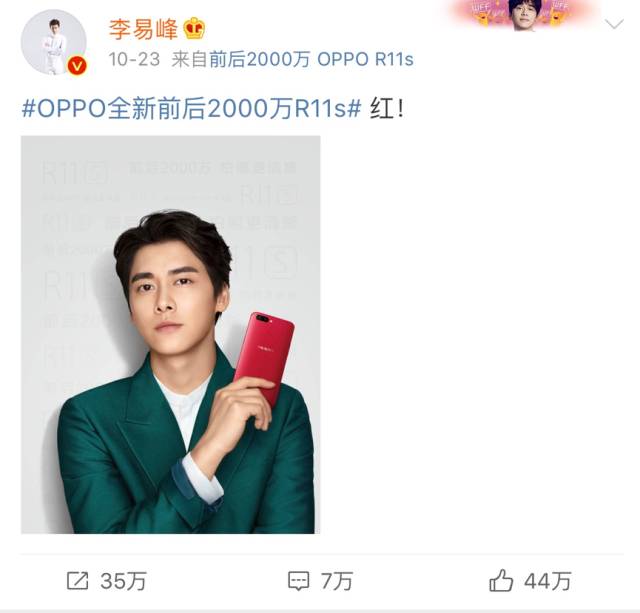 作为OPPO的代言人,李易峰一条推广性质的微博,在12小时内,创造了4万转发、5000个赞、1600条评论、1亿的话题阅读量,微博再次向外界展示出粉丝经济的威力。而OPPO选择了微博作为出口,也是看中了李易峰的粉丝最集中、最活跃的地方就是微博,他们渴望在社交网络上表达对偶像的热爱。